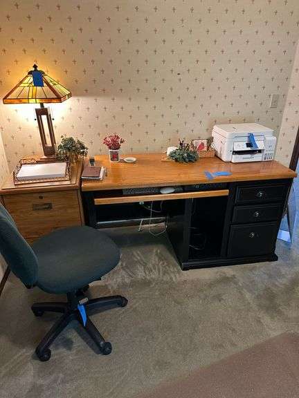 LOT 61 - Oak Desk Set with Filing Cabinet (excluding lamp) with Rolling Chair, Epson Printer